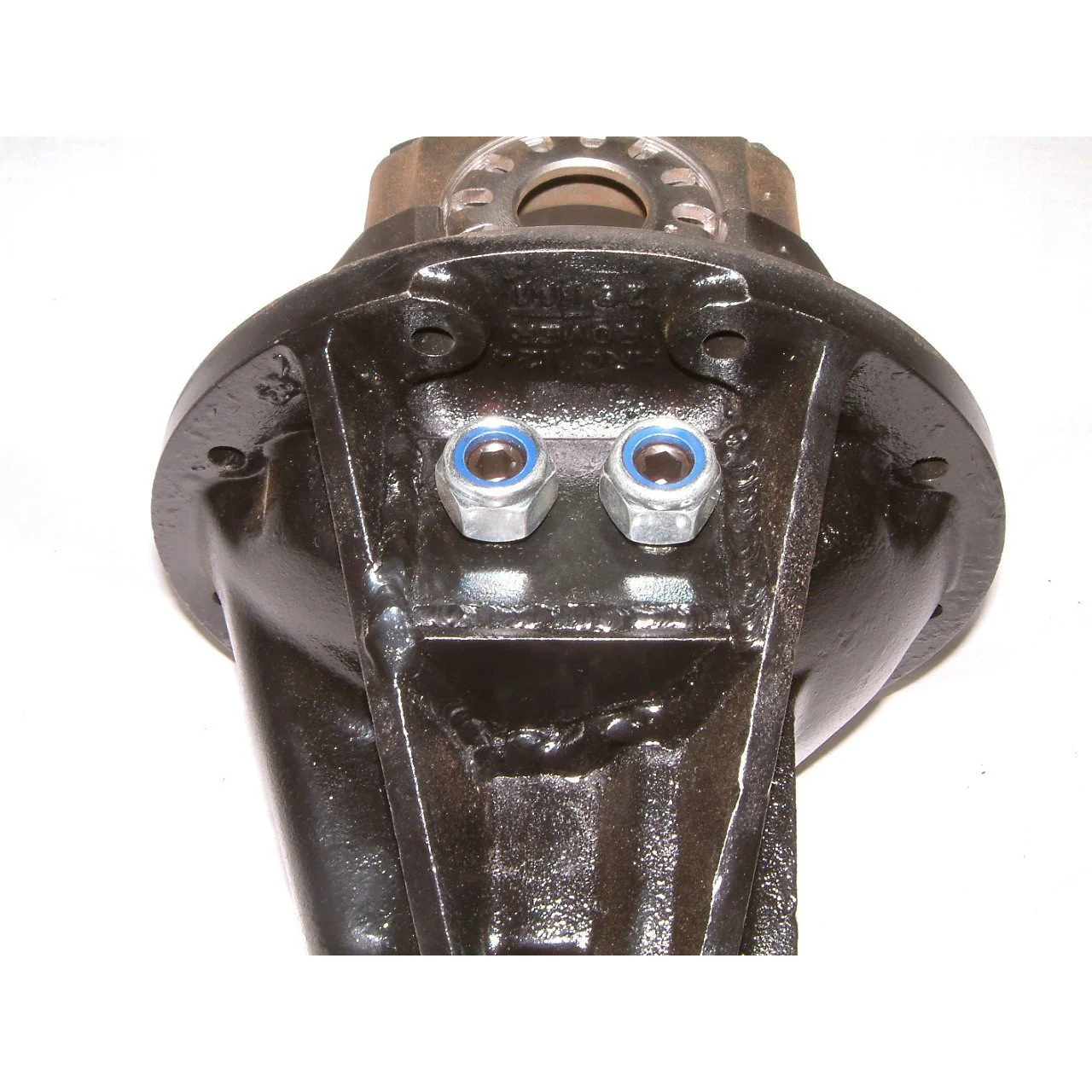 This is done by welding a plate on the outside of the diff and drilling and tapping two M16 holes through the plate and through the diff housing. We then fit 2 dog point screws in these holes and two Nyloc nuts on the outside. We fit a phosphor bronze thrust pad inside the diff, which locates on the screws then fit the diff centre back in. Once the diff centre has the backlash and preload set we then adjust the thrust pad in so it lightly touches, then back the screws out a quarter of a turn. It is a good idea to adjust the thrust pad to allow for wear every 6 months or so.